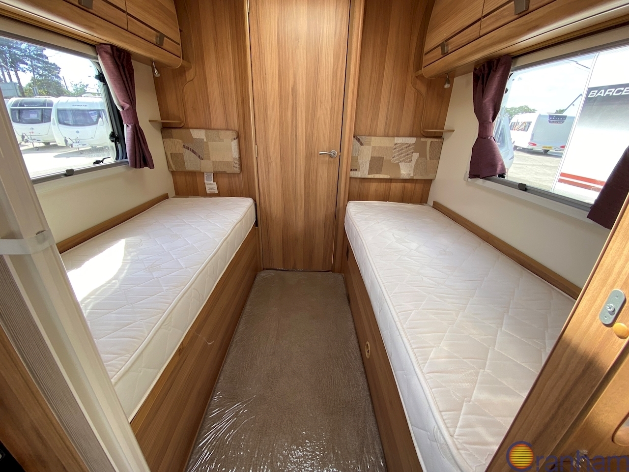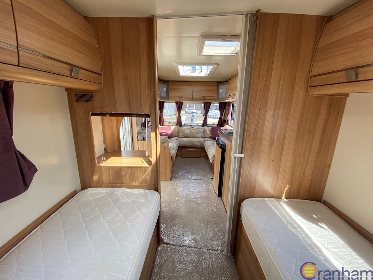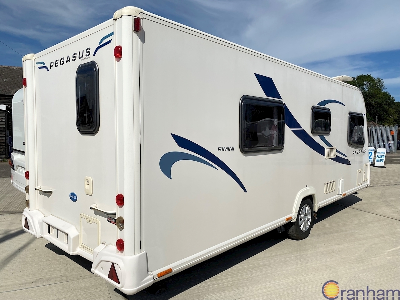 2012 Bailey Pegasus Rimini single bed layout caravan for sale in Essex. The Rimini offers the night-time comfort of single fixed beds at a mid-market price. The second generation Pegasus will be replaced by the Pegasus GT65 in the spring of 2013, but the Pegasus II still has a lot to offer. Bailey’s Alu-tech construction promises strength and durability, while the 2.28m (7ft 6in) width means there’s lots of space inside. In fact, since the Pegasus GT65 will be narrower in order to reduce weight, so some buyers may prefer the older design. The Pegasus II has a reputation for good value, and there’s enough kit in the Rimini to make you think twice about buying a more expensive tourer.