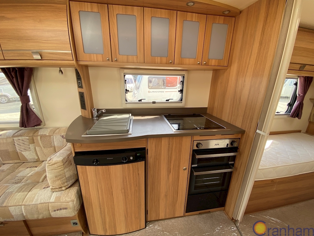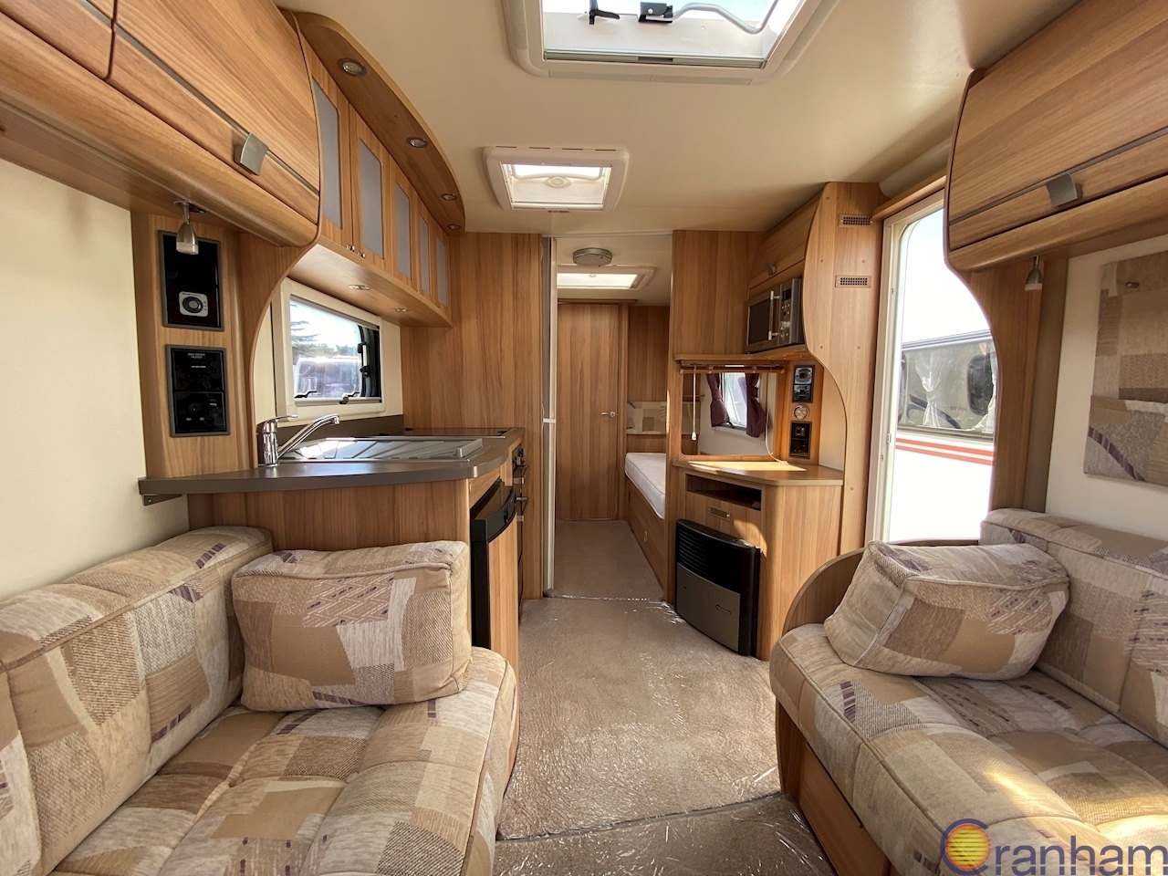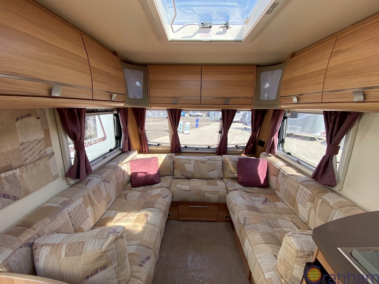 2012 Bailey Pegasus Rimini single bed layout caravan for sale in Essex. The Rimini offers the night-time comfort of single fixed beds at a mid-market price. The second generation Pegasus will be replaced by the Pegasus GT65 in the spring of 2013, but the Pegasus II still has a lot to offer. Bailey’s Alu-tech construction promises strength and durability, while the 2.28m (7ft 6in) width means there’s lots of space inside. In fact, since the Pegasus GT65 will be narrower in order to reduce weight, so some buyers may prefer the older design. The Pegasus II has a reputation for good value, and there’s enough kit in the Rimini to make you think twice about buying a more expensive tourer.