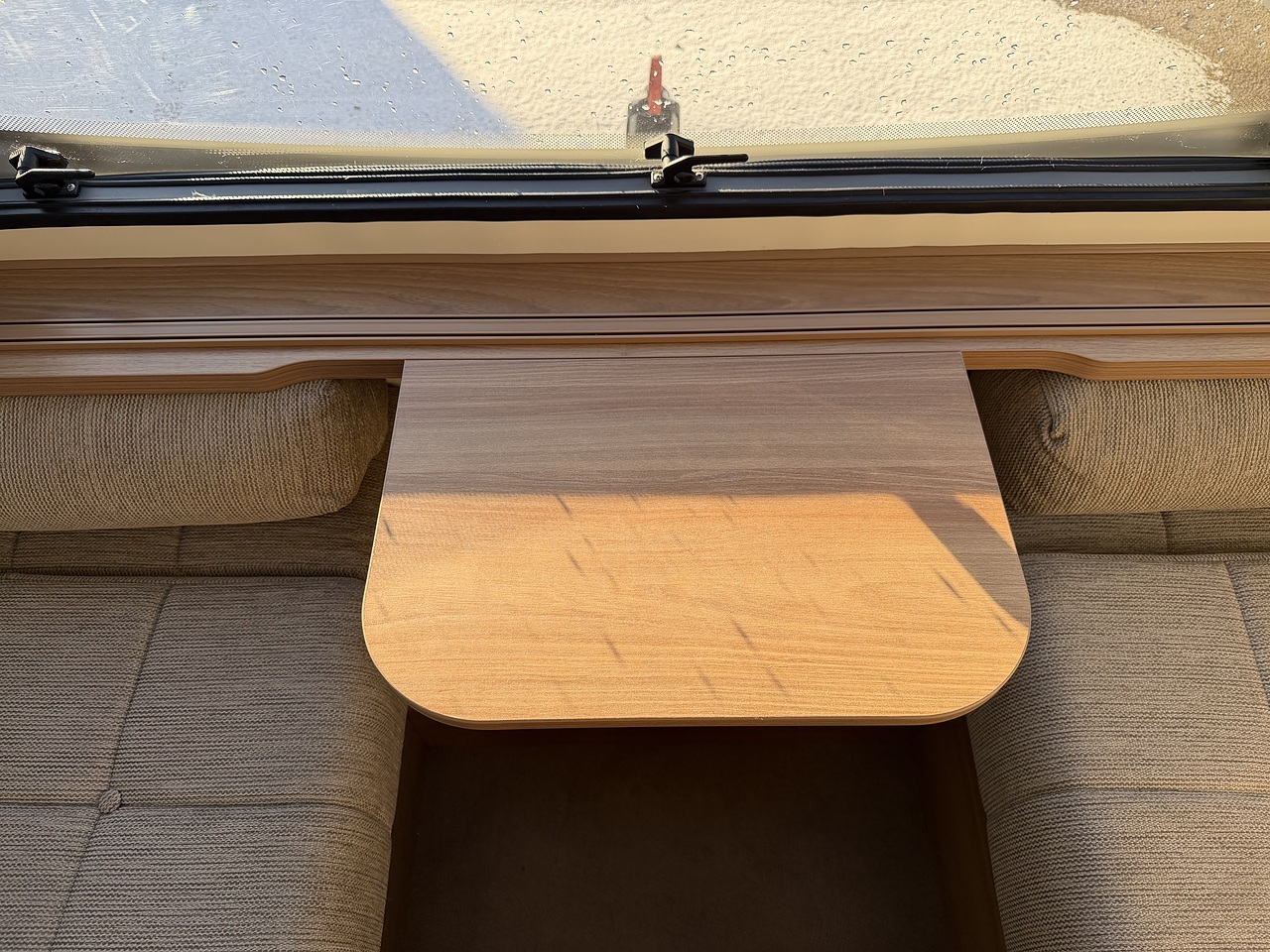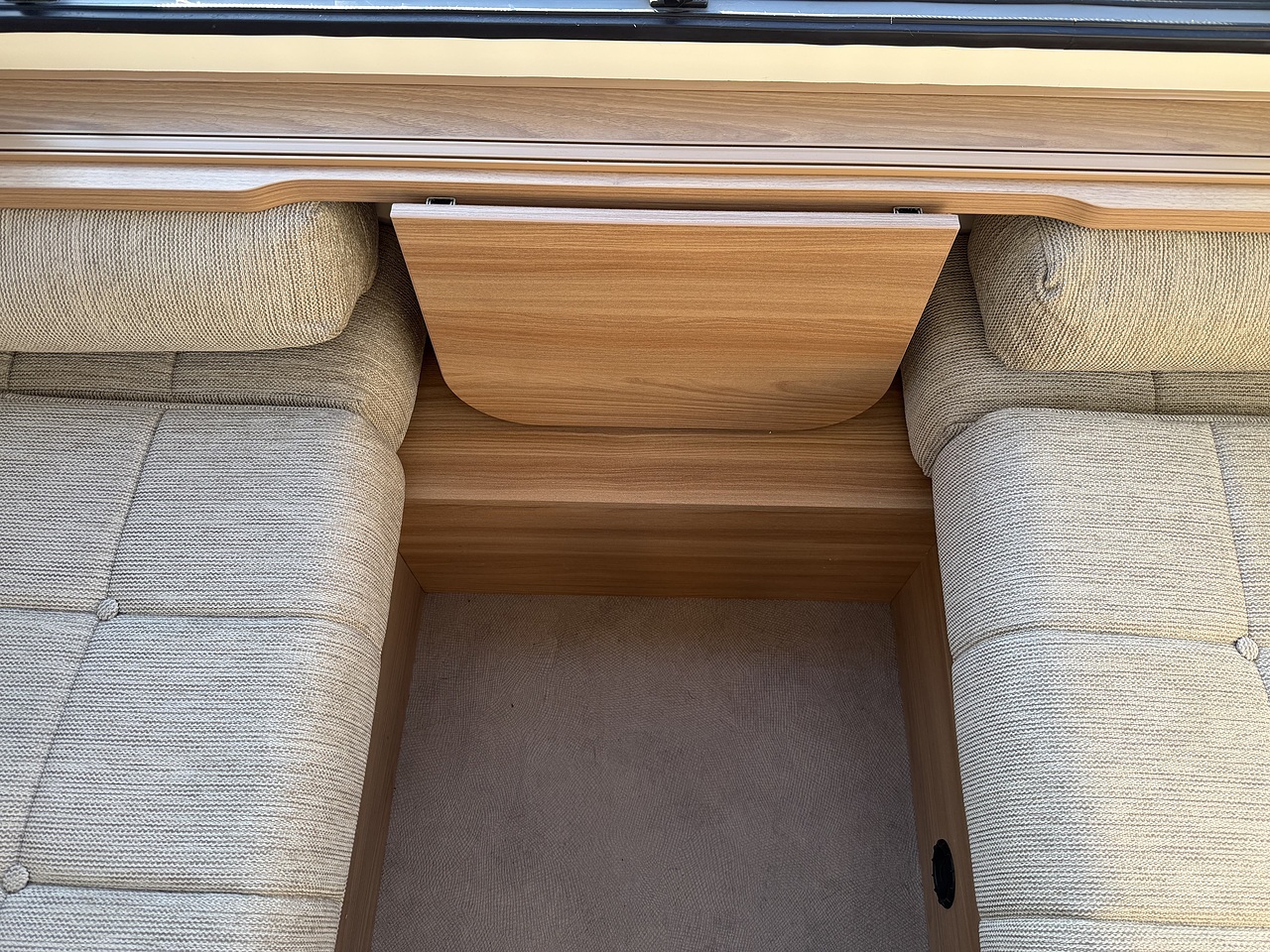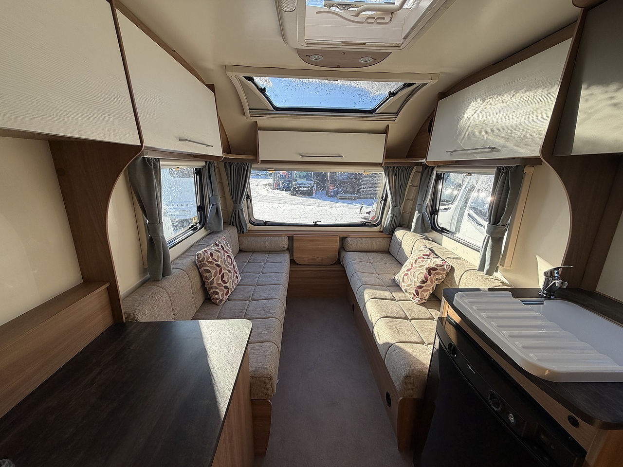 The front lounge provides a bright and welcoming living area with comfortable parallel seating, which easily converts into either a large double bed or two single beds. Large windows allow plenty of natural light to flood the interior, creating an airy and relaxing atmosphere, while the high internal headroom adds to the feeling of space.