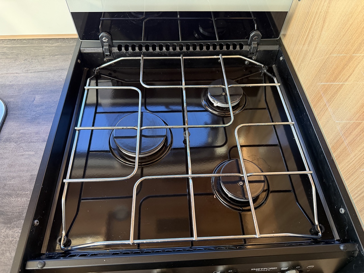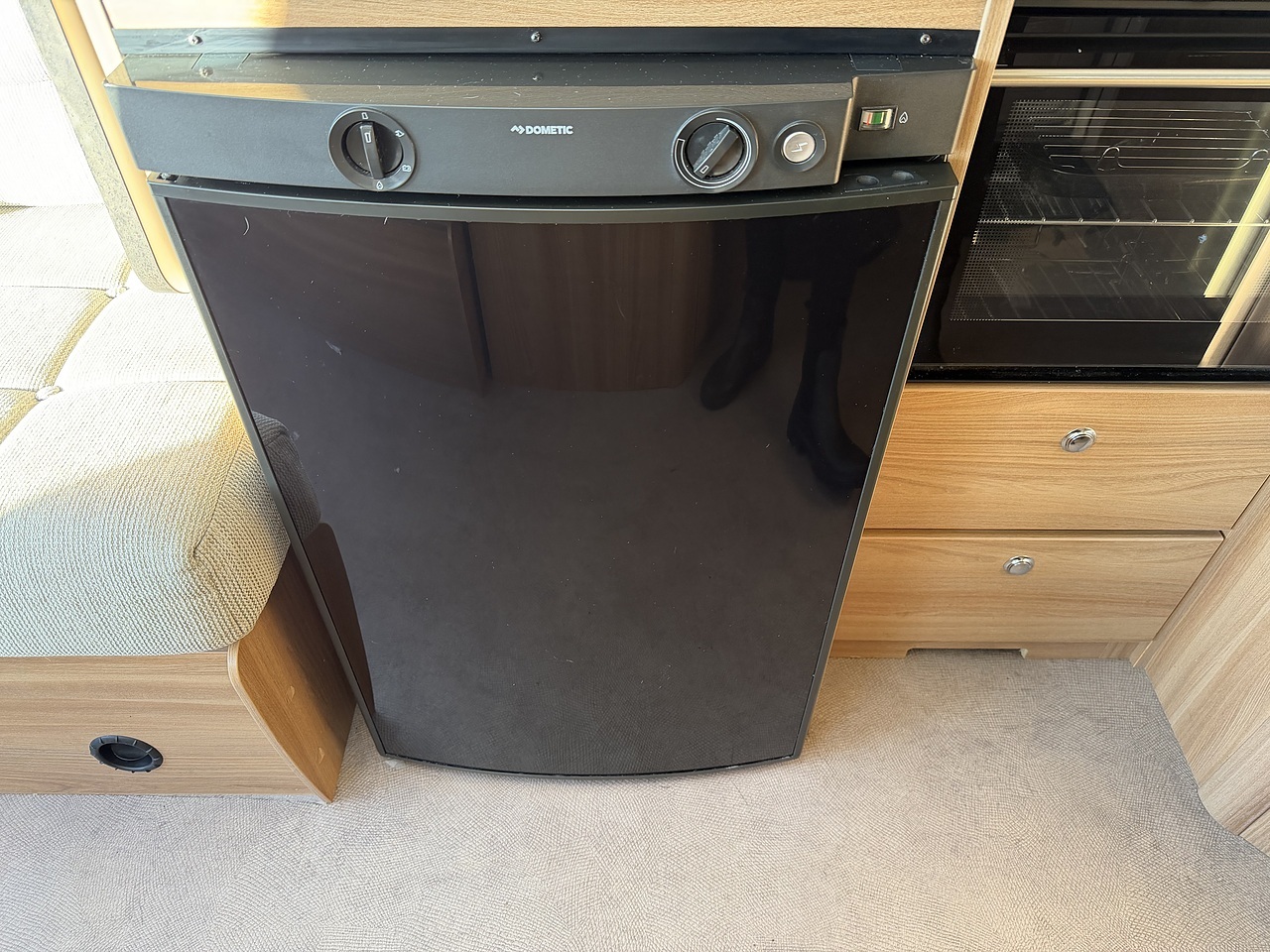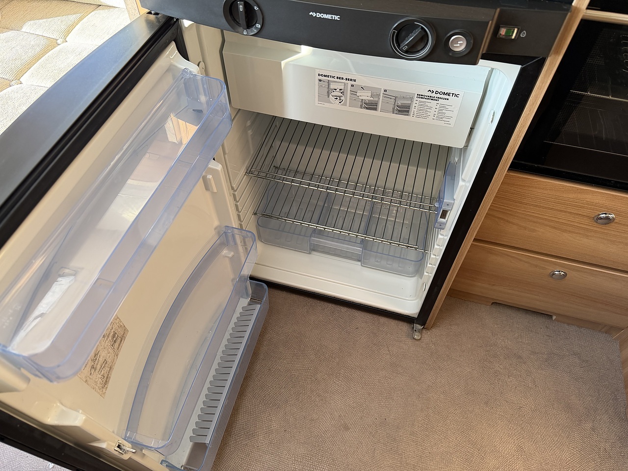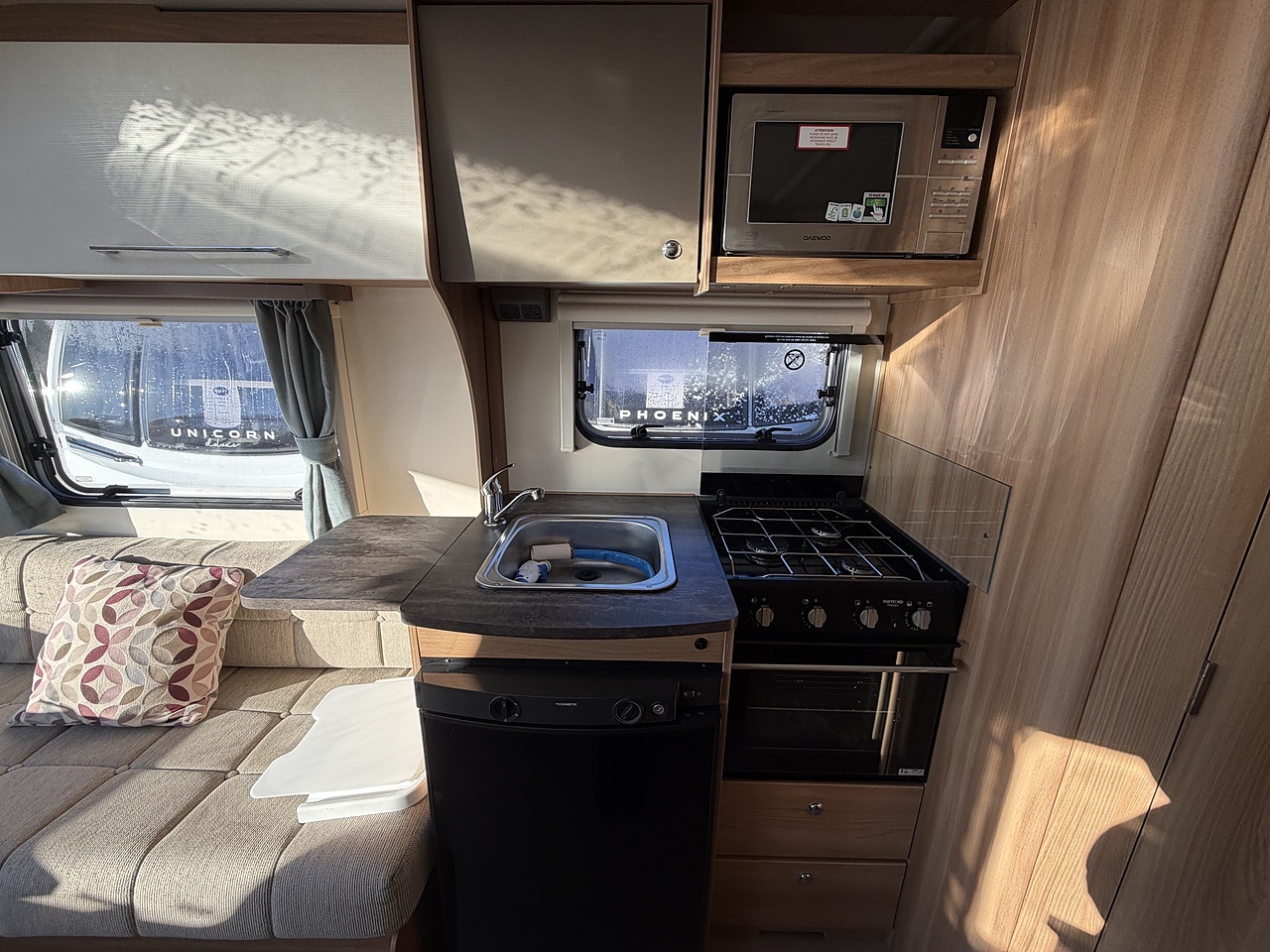 The kitchen is well equipped for touring and includes a Dometic fridge, a Thetford Triplex cooker with oven, grill and three-burner hob, and a stainless-steel sink with mixer tap. There is ample worktop space and storage, making meal preparation simple whether you are away for a weekend or a longer tour.
