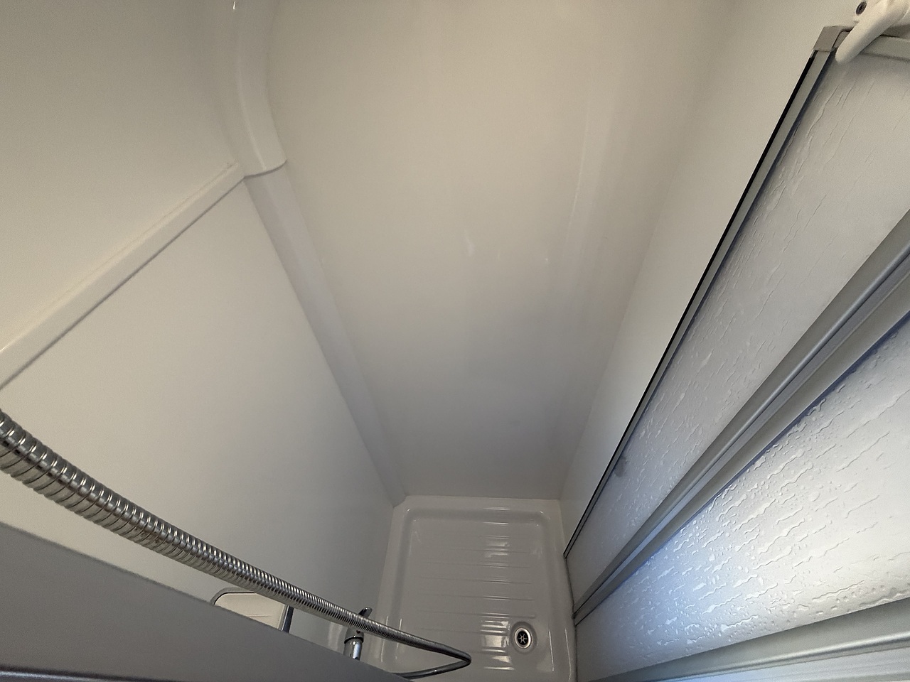 At the rear, the caravan features a spacious full-width end washroom, which is impressive for a caravan of this size. It includes a separate domestic-style shower cubicle, cassette toilet and wash basin, providing excellent privacy and comfort when on site.