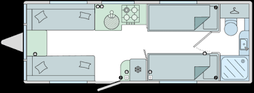 The layout features a front lounge with parallel seating, creating a bright and open living space with a large panoramic front window. This area can be used as two single beds or converted into a double when required.