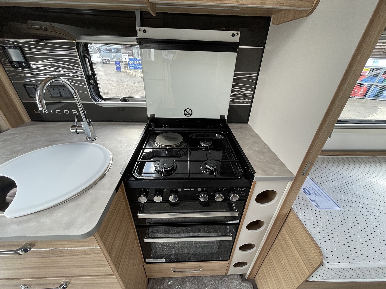 Moving through the centre of the caravan, the kitchen is positioned opposite the main living area, providing a practical workspace with good storage and preparation space. It comes equipped with a hob, oven, grill, microwave, and fridge freezer, making it suitable for both short trips and longer stays.
