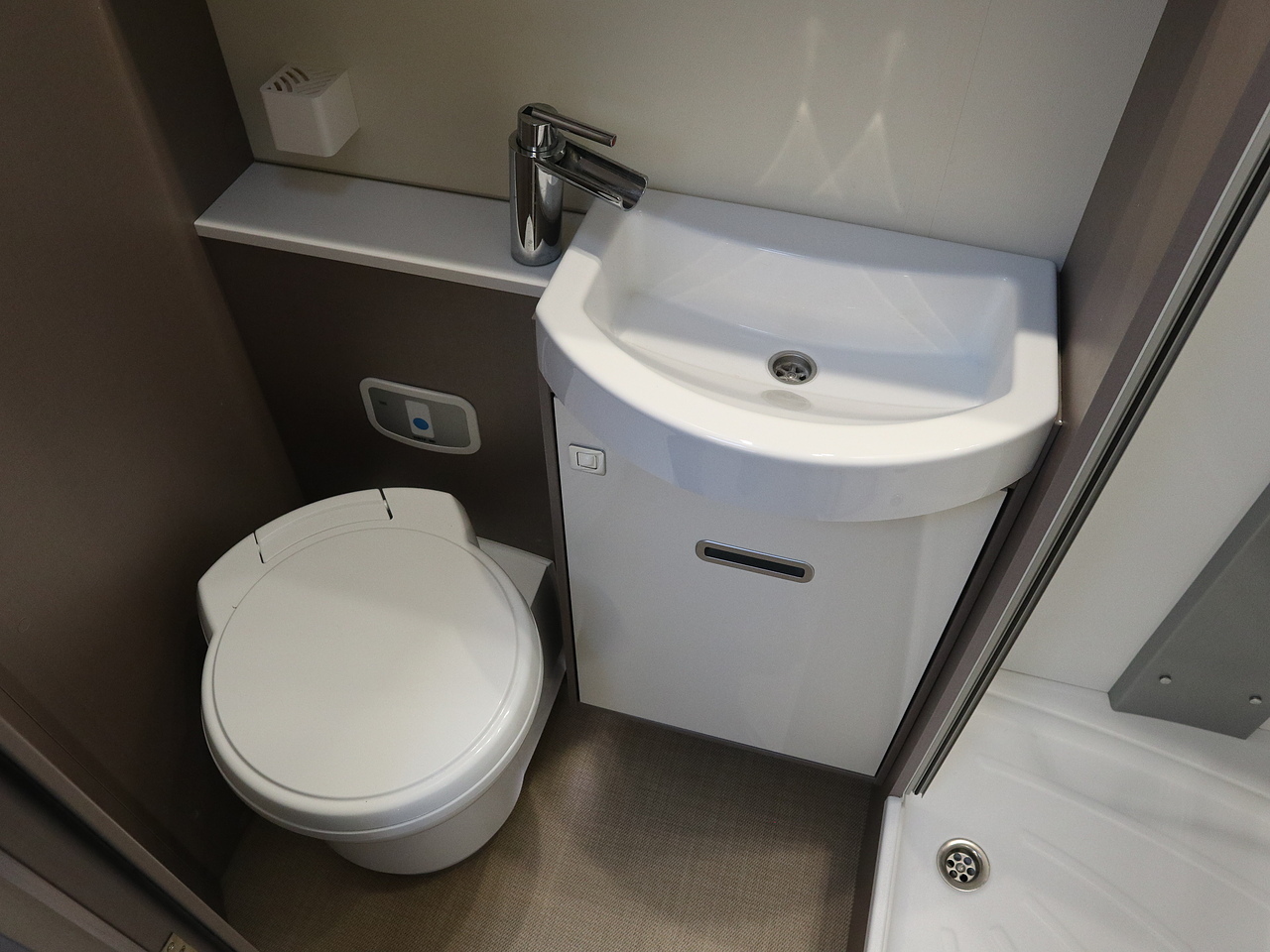 -Bathroom: A central washroom featuring a cassette toilet, washbasin, and a separate shower cubicle.