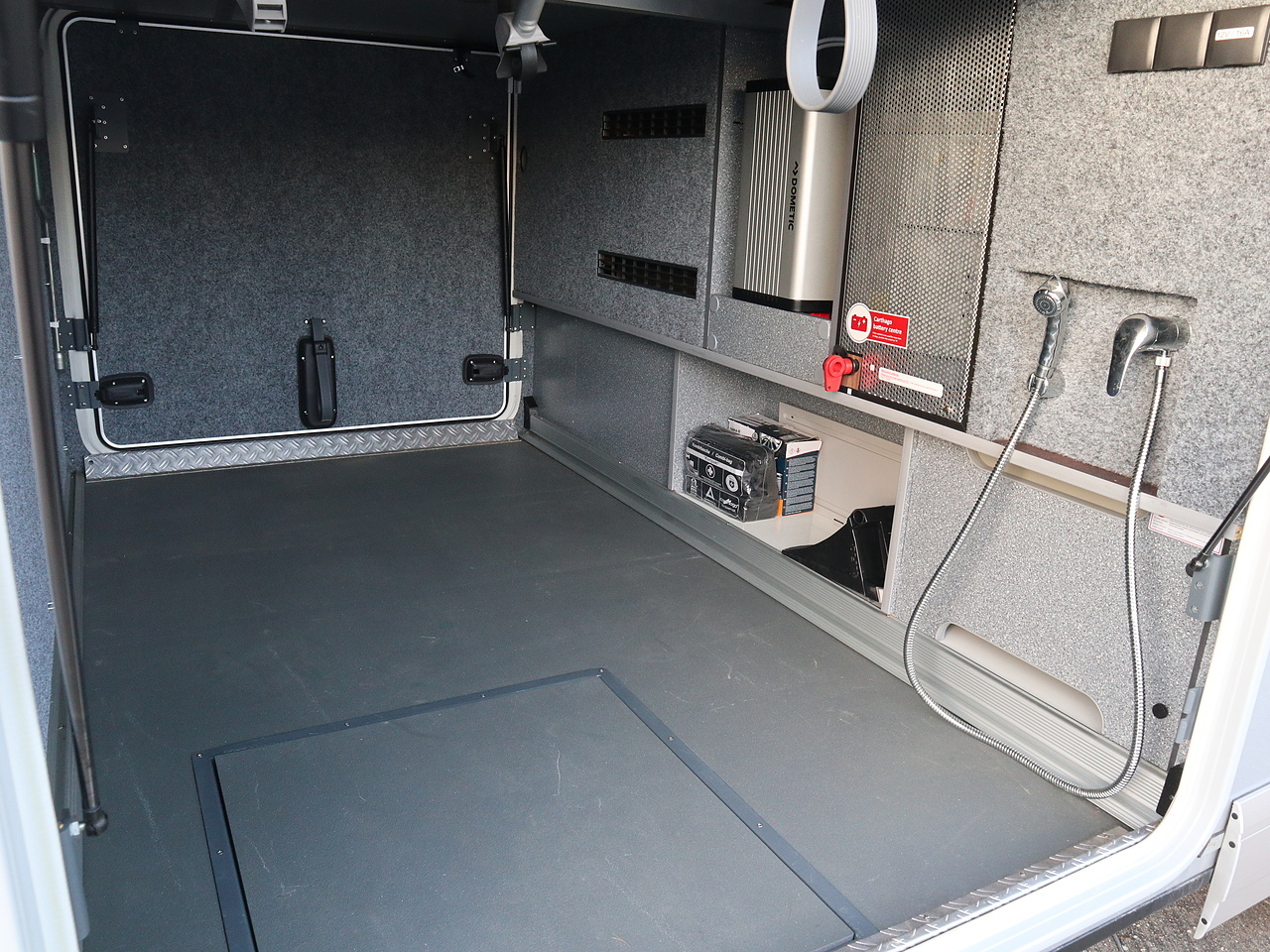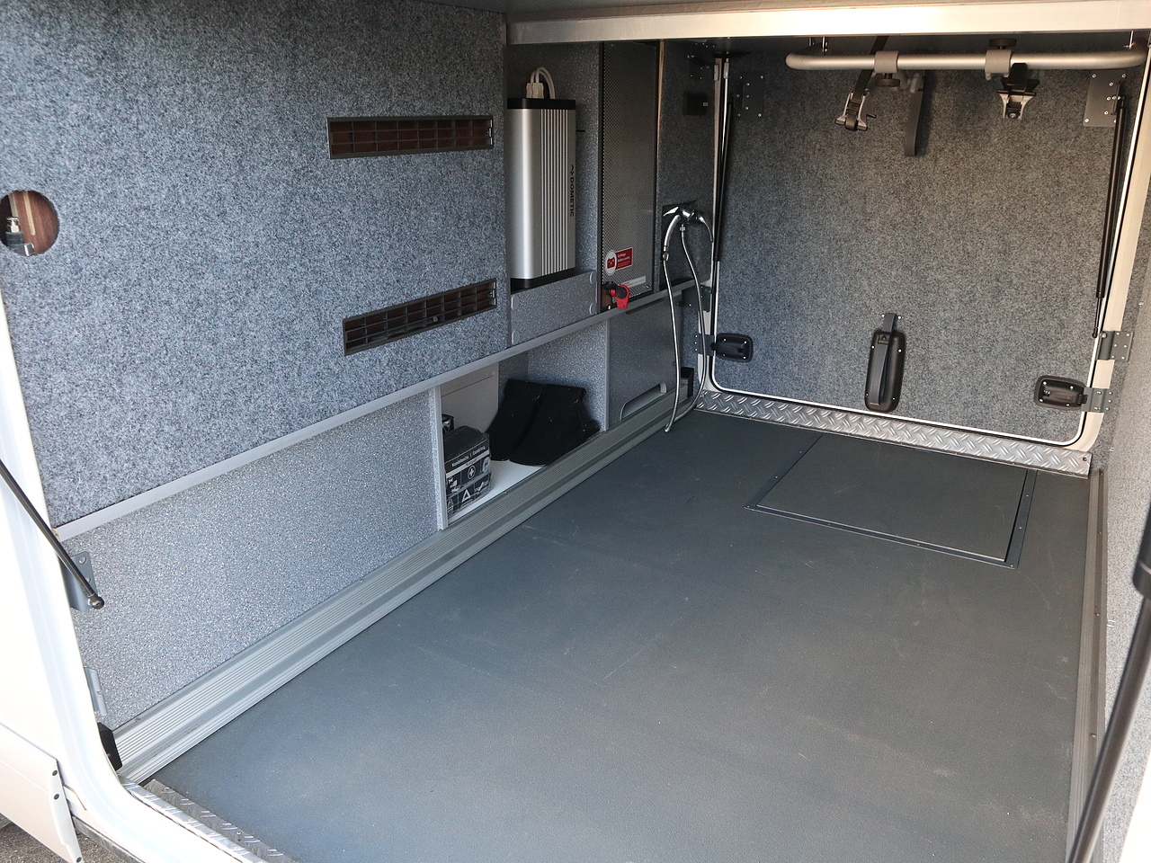 + Double floor with huge heated storage compartment, usable height up to 70 cm