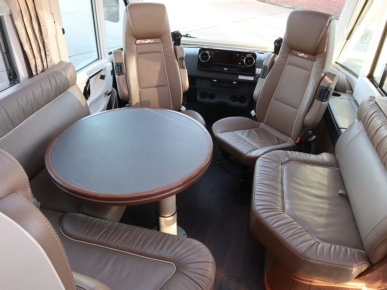 + Living area seat upholstery with comfortable ergonomics and side leather panels with Carthago C-branding