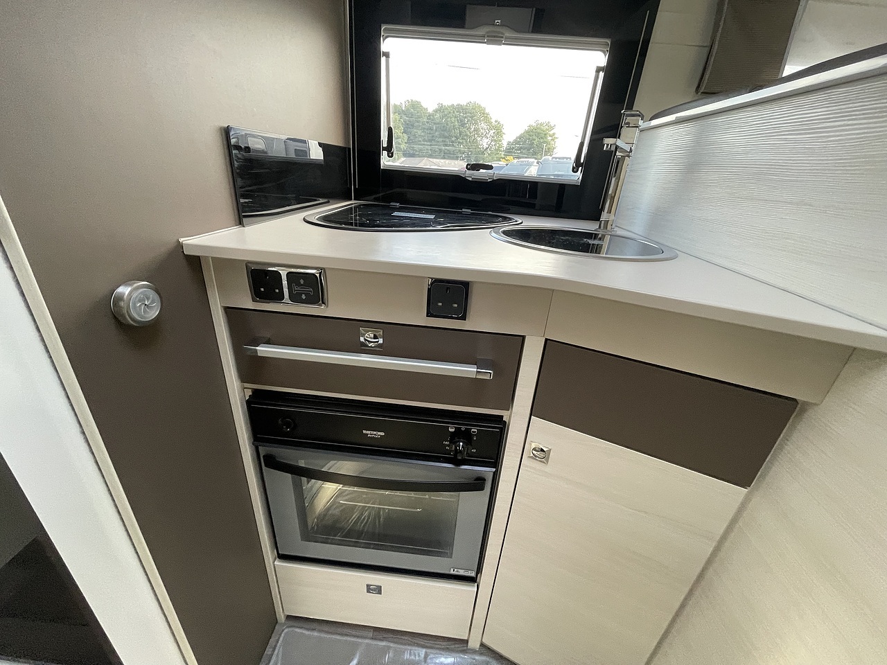 Clever interior layout: Electric drop-down double bed over the lounge, plus a convertible lounge bed, giving two full-size doubles. Full rear washroom with a separate shower cubicle. Functional kitchen with 3-burner hob, oven/grill, and a 3-way fridge/freezer. Heating and hot water powered by gas or electric, plus extras like awning and reversing camera.