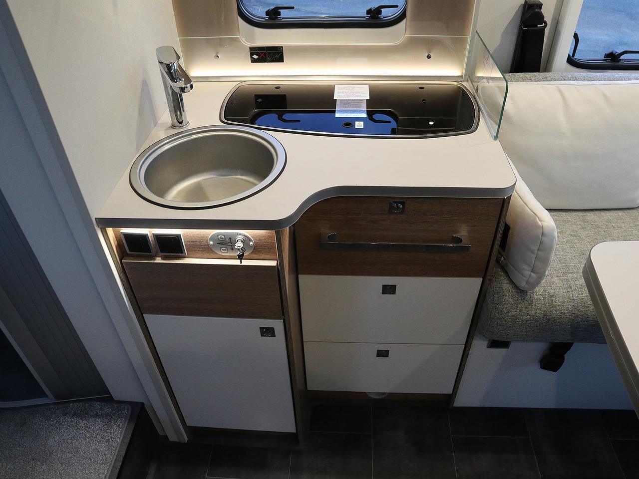 Kitchen: Equipped with a 142-litre fridge/freezer, a three-burner hob , and a circular sink.
