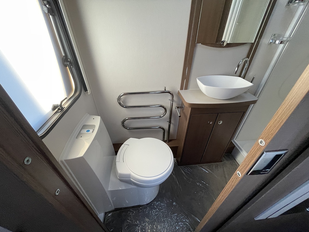 At the rear, you’ll find a full-width end washroom, complete with a separate shower cubicle, cassette toilet, wash basin, and storage, providing a spacious and private bathroom area ideal for touring.