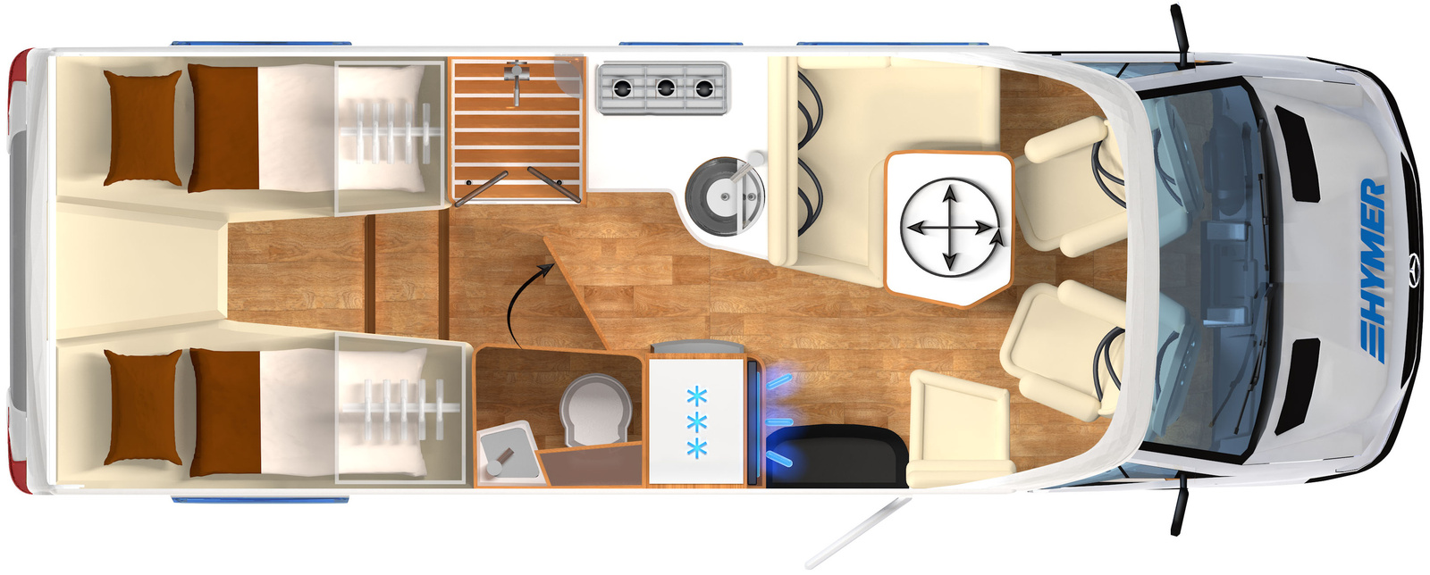 An electric drop-down double bed over the cab maximises living space during the day while providing a comfortable sleeping solution at night. Additional bed infill cushions enhance flexibility for extended touring.