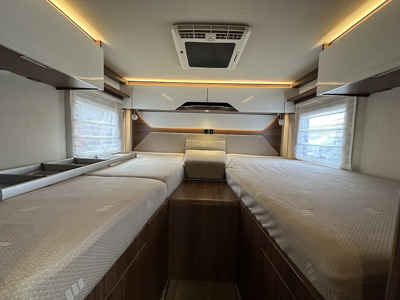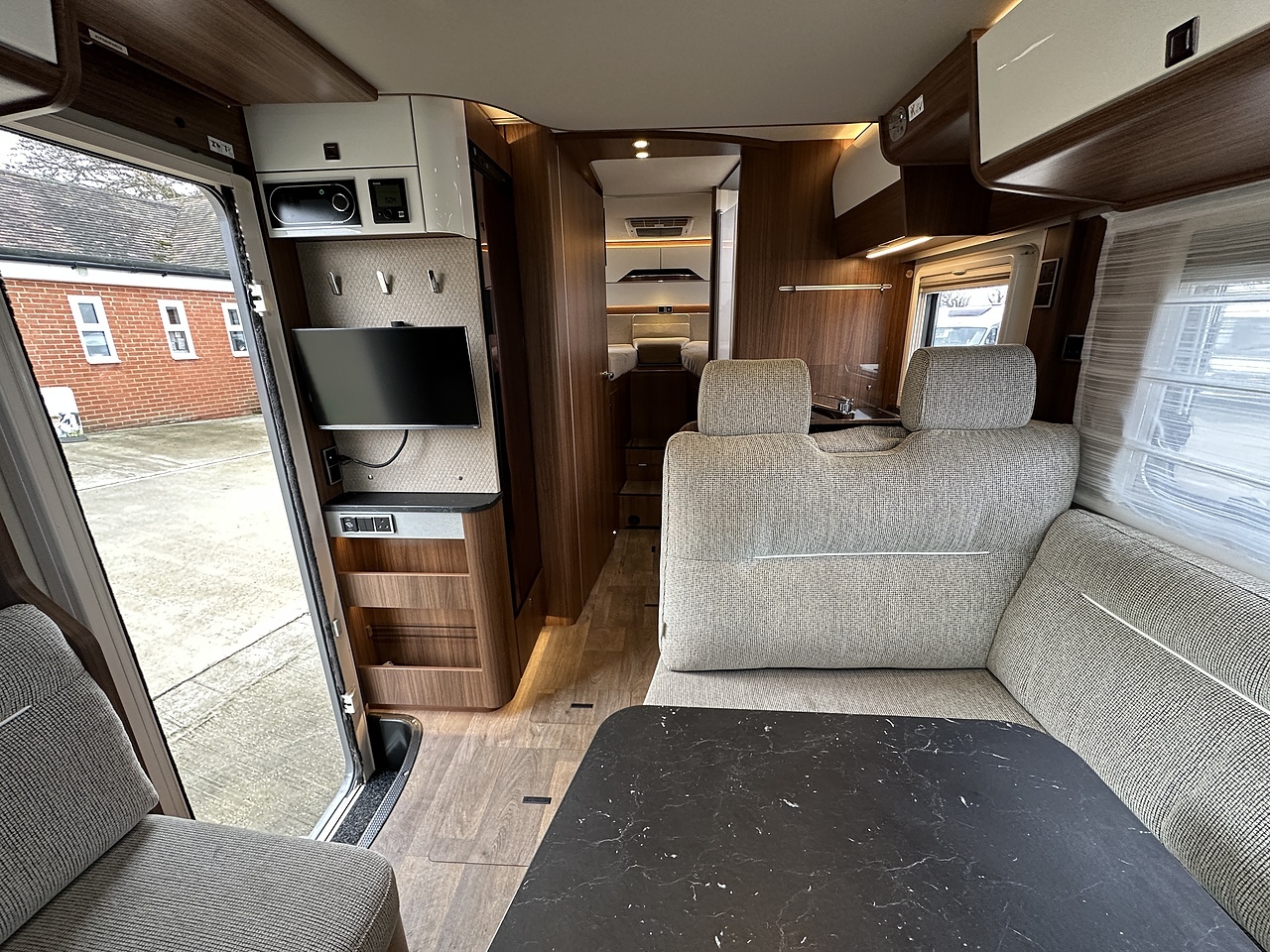 The interior showcases Hymer’s renowned craftsmanship with Noce Cognac furniture and Delfi fabric upholstery, creating a warm, modern, and luxurious environment. The front L-shaped lounge benefits from swivel Mercedes pilot seats, ambient LED lighting, and a panoramic rooflight that floods the living area with natural light.