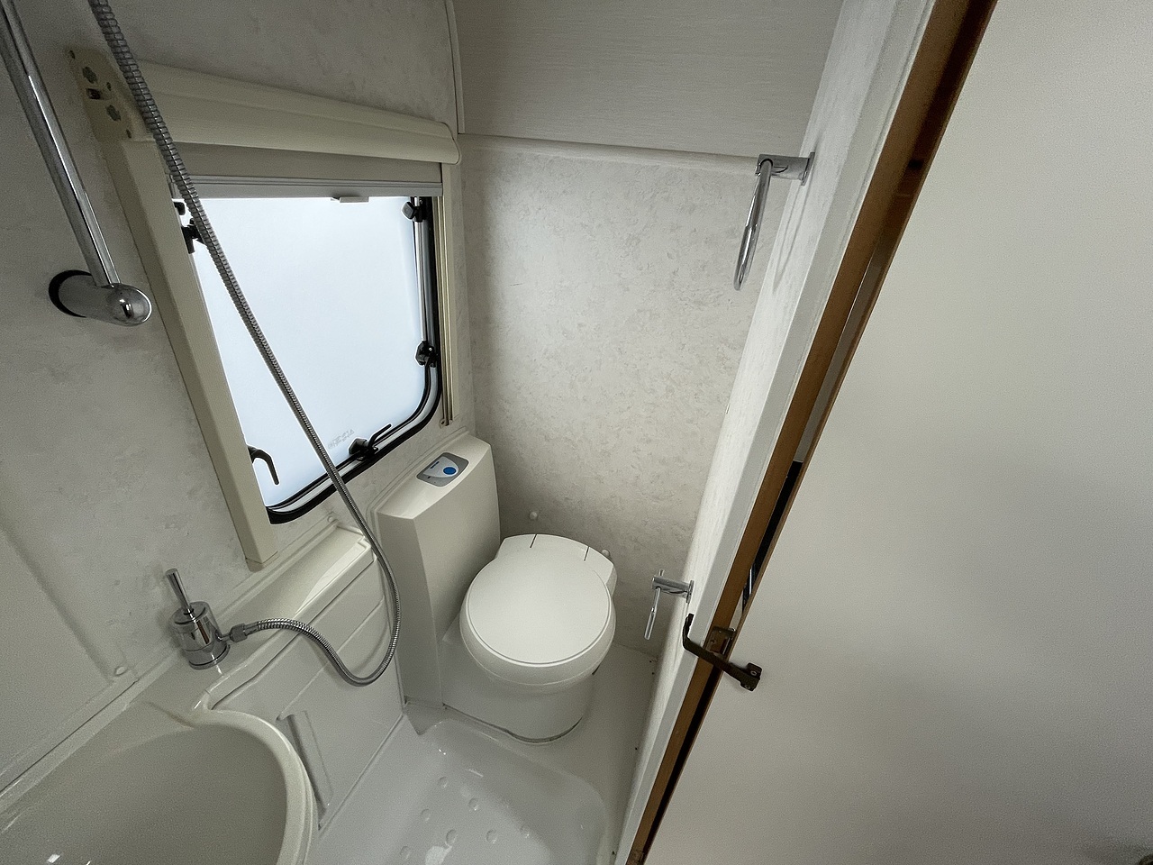 Step inside to find a stylish, thoughtfully designed living space. The lounge area is bright and airy, perfect for relaxing or entertaining, and easily converts into a generous double bed. The kitchen is compact but well-equipped, ideal for both short breaks and extended trips. A neatly designed washroom at the rear offers privacy and convenience without compromising space. The upholstery and wood finishes showcase Lunar’s commitment to craftsmanship and comfort.