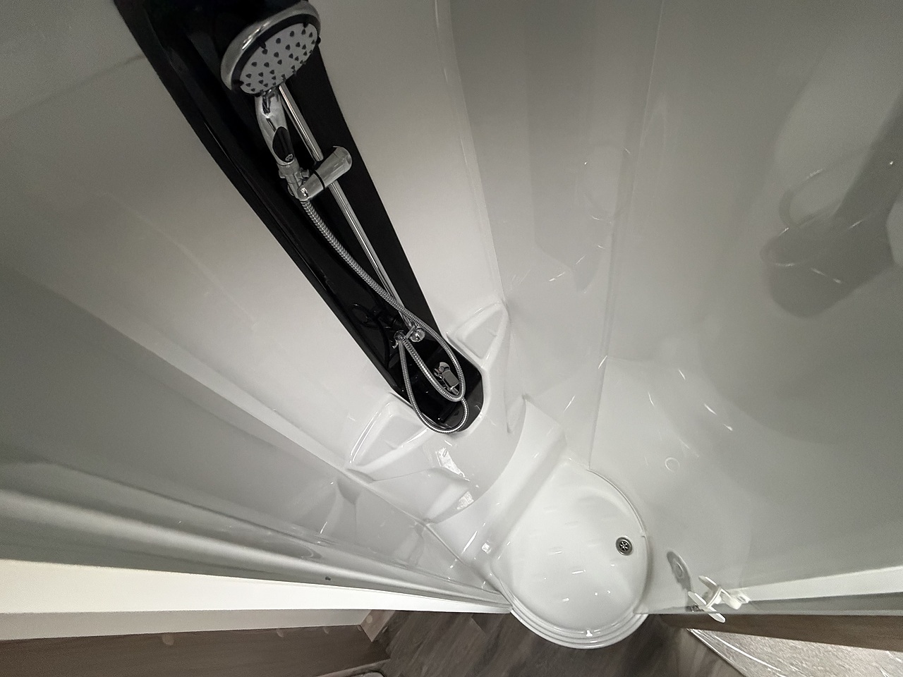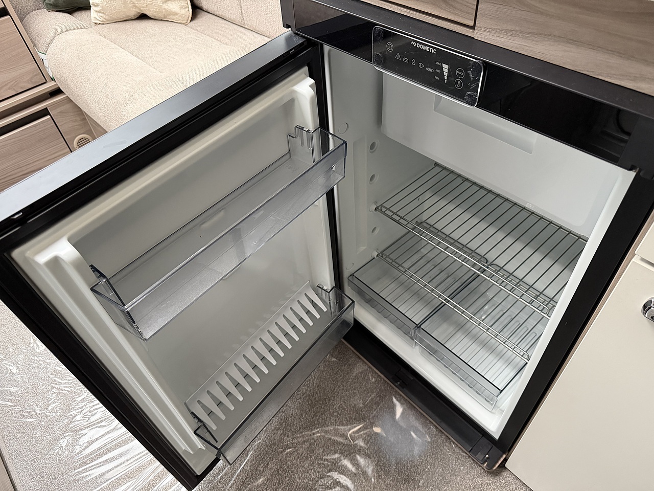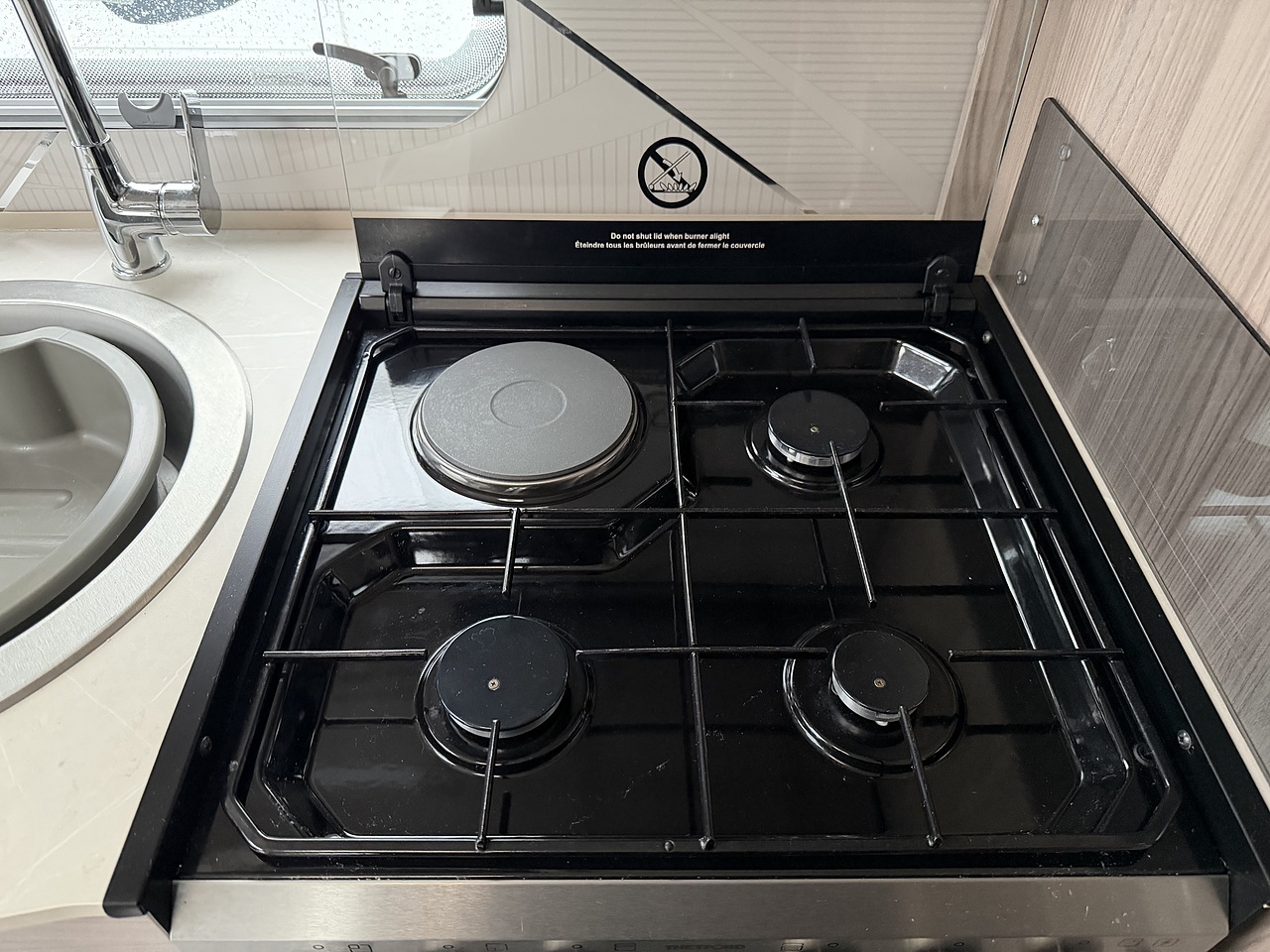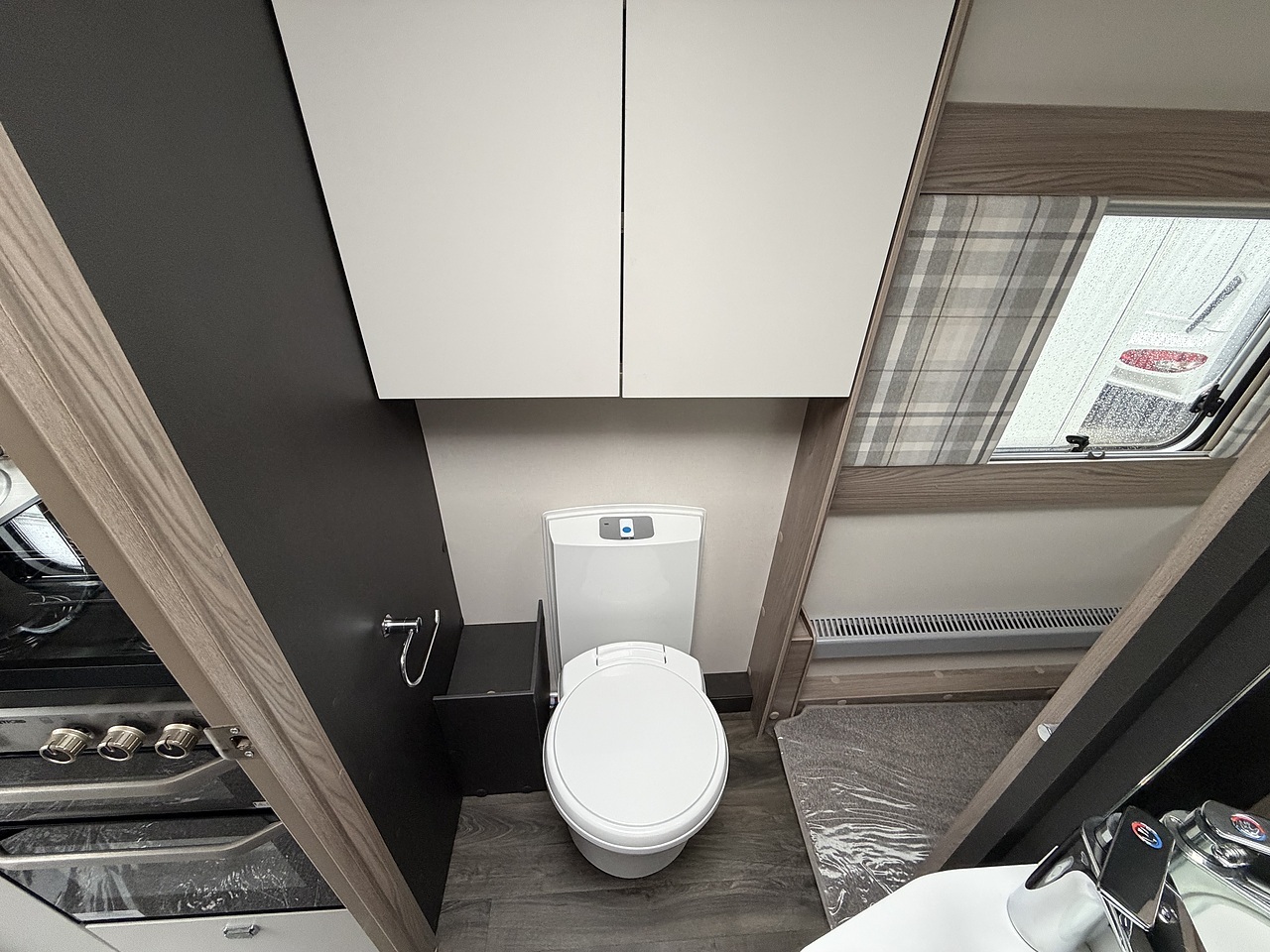 The kitchen area is equipped with everything a touring chef could want, including a three-burner gas hob with electric hotplate, oven and grill, microwave, and a fridge-freezer. There’s plenty of storage and workspace, making mealtimes simple and enjoyable. The mid-washroom provides a separate shower cubicle, washbasin, and toilet, combining practicality with modern design.