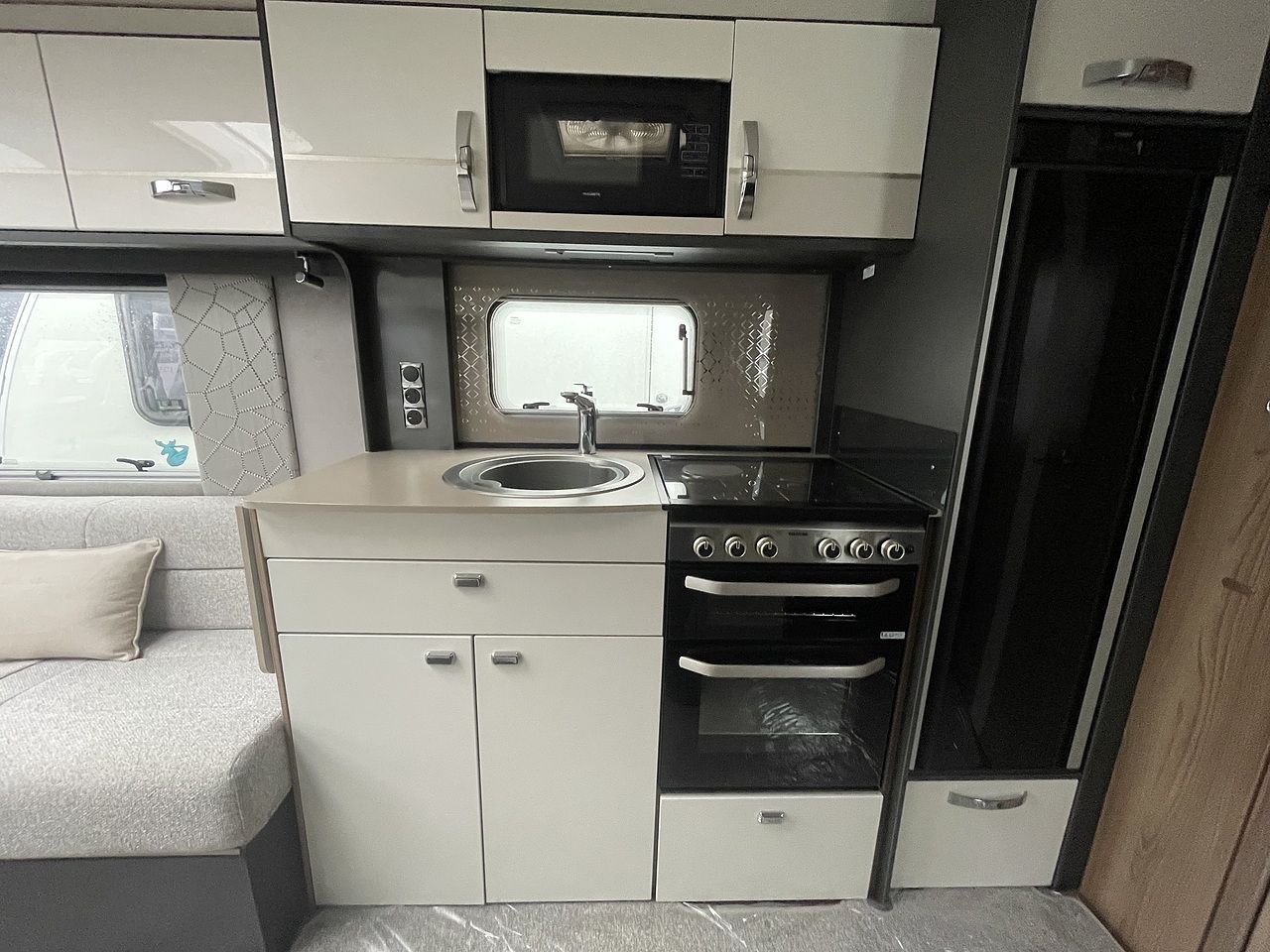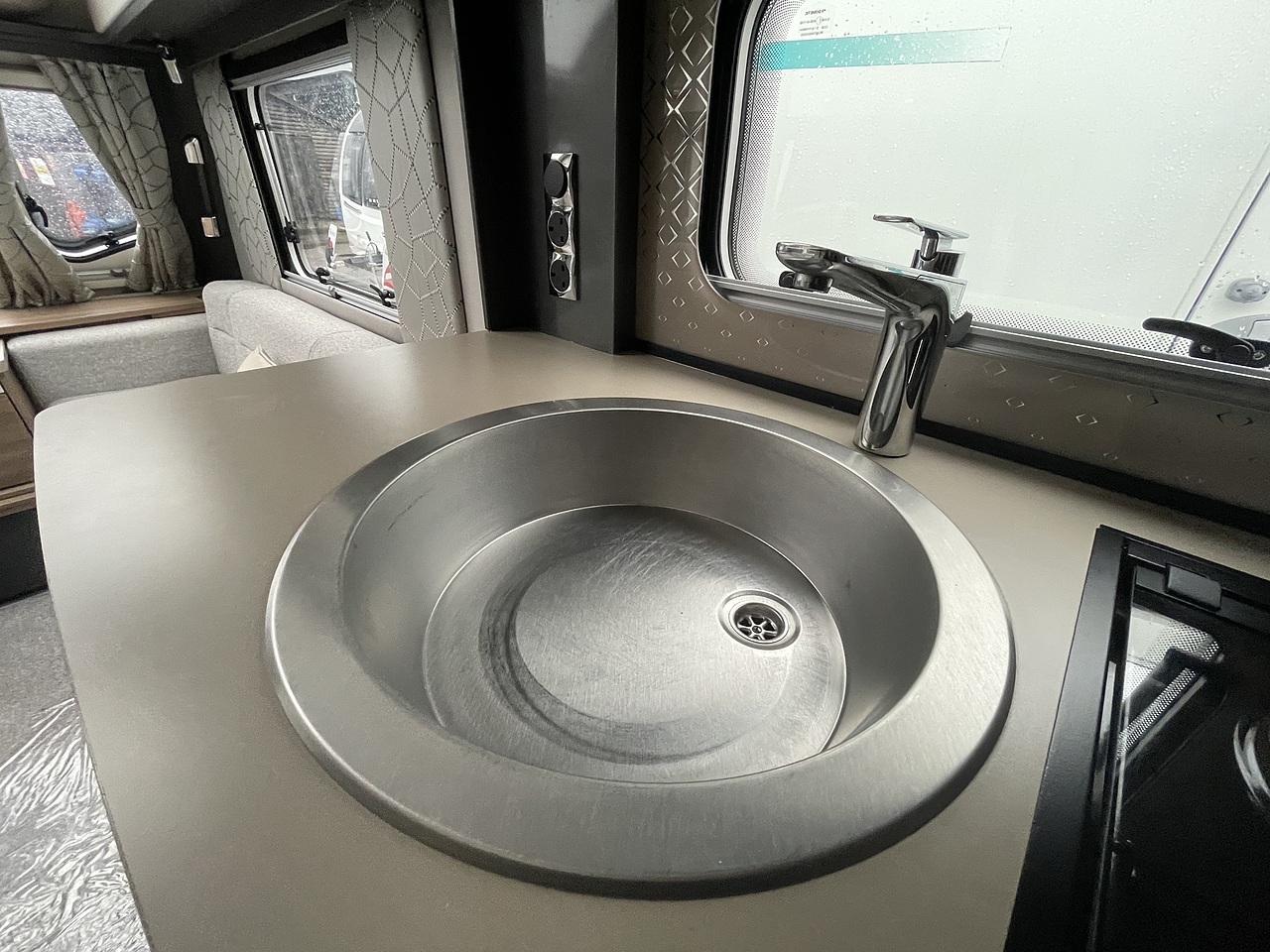 Interior and Lounge - The front lounge features parallel seating, large windows, and a panoramic sunroof, creating a bright and welcoming space. It converts easily into either two single beds or a generous double bed. High-end furnishings, soft-close drawers, and ambient lighting give it a refined, home-like feel.