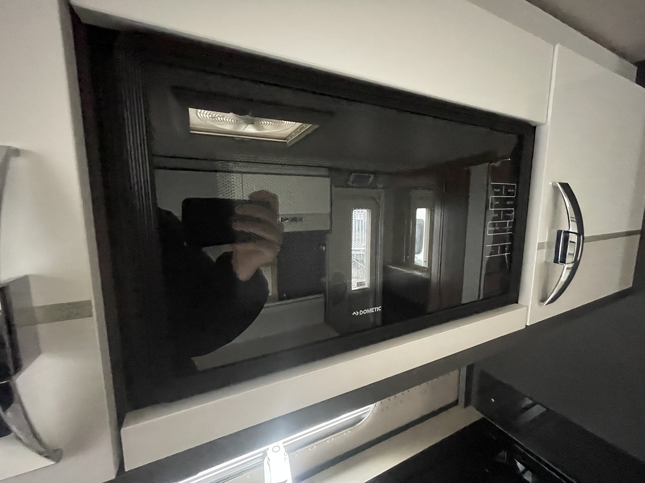 Kitchen - The midships kitchen is well-equipped with a dual-fuel hob (three gas burners and one electric plate), separate oven and grill, microwave, and slimline fridge-freezer. Durable Fenix worktops, LED lighting, and built-in USB/mains outlets add convenience and style.