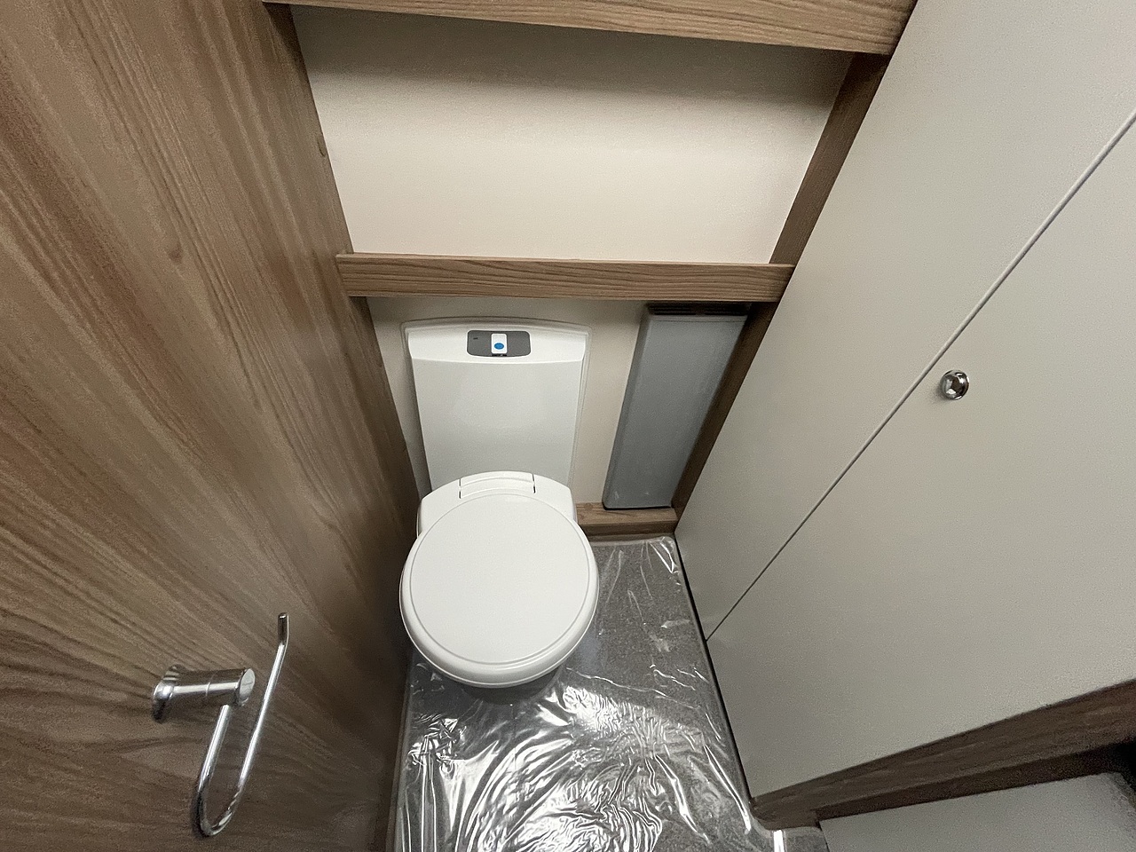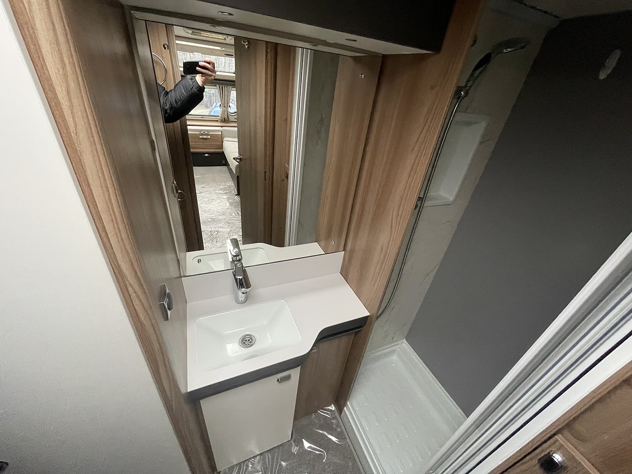 Washroom - The full-width rear washroom includes a separate shower cubicle, Thetford cassette toilet, vanity sink, wardrobe, and an Alde radiator for warmth. Ventilation is provided by a roof light, as this model does not feature a washroom window.